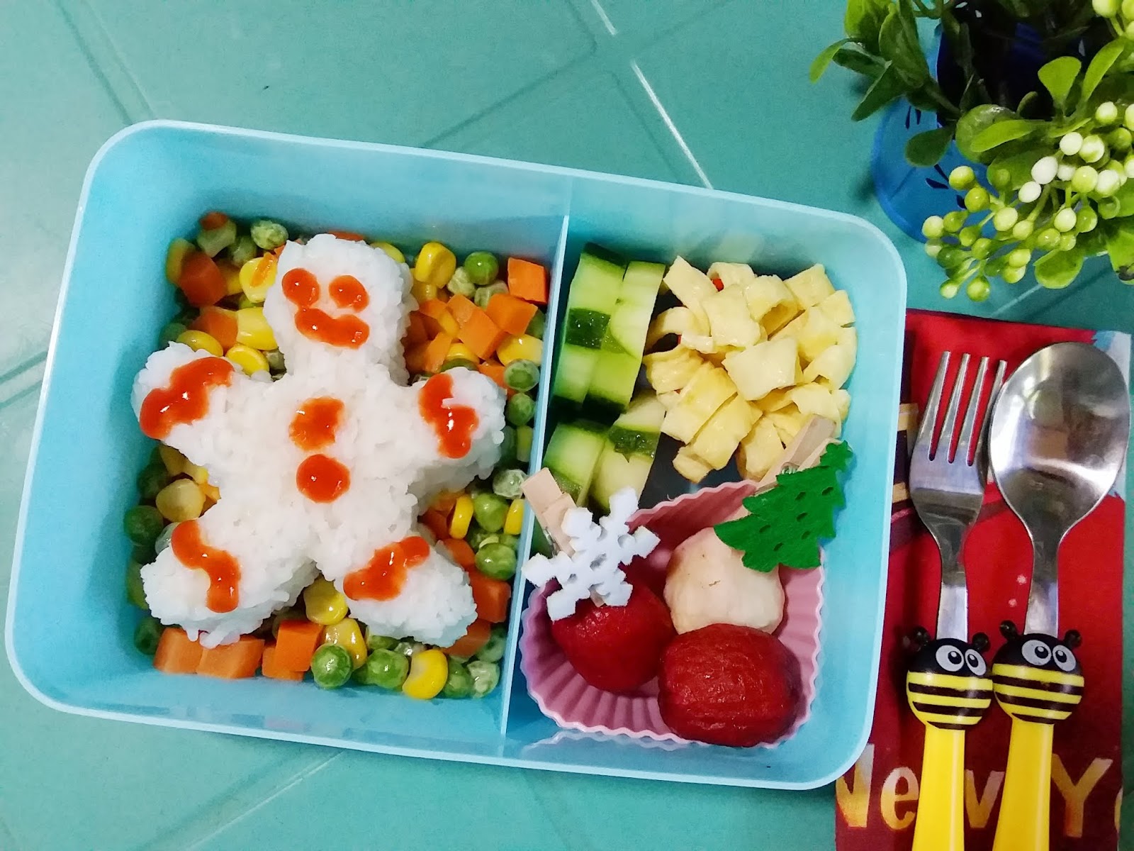 | Fried rice topped with sausage, fish ball and ham skewers, lettuce, carrot and cucumber slices, salad dressing and "Santa" marshmallow. Insert a Christmas themed pick for instant holiday feels! |